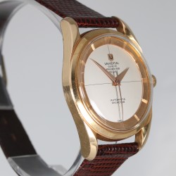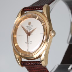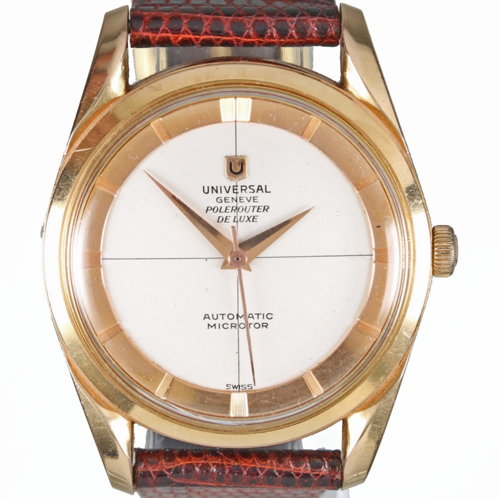 Universal Geneve modelo Polerouter DeLuxe con caja de oro de 34mm y cristal de plexiglass. Movimiento automático con el famoso micro rotor inventado por Universal Geneve. Atractiva esfera sectorizada blanca en muy buen estado de conservación. El reloj está en buen estado.