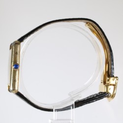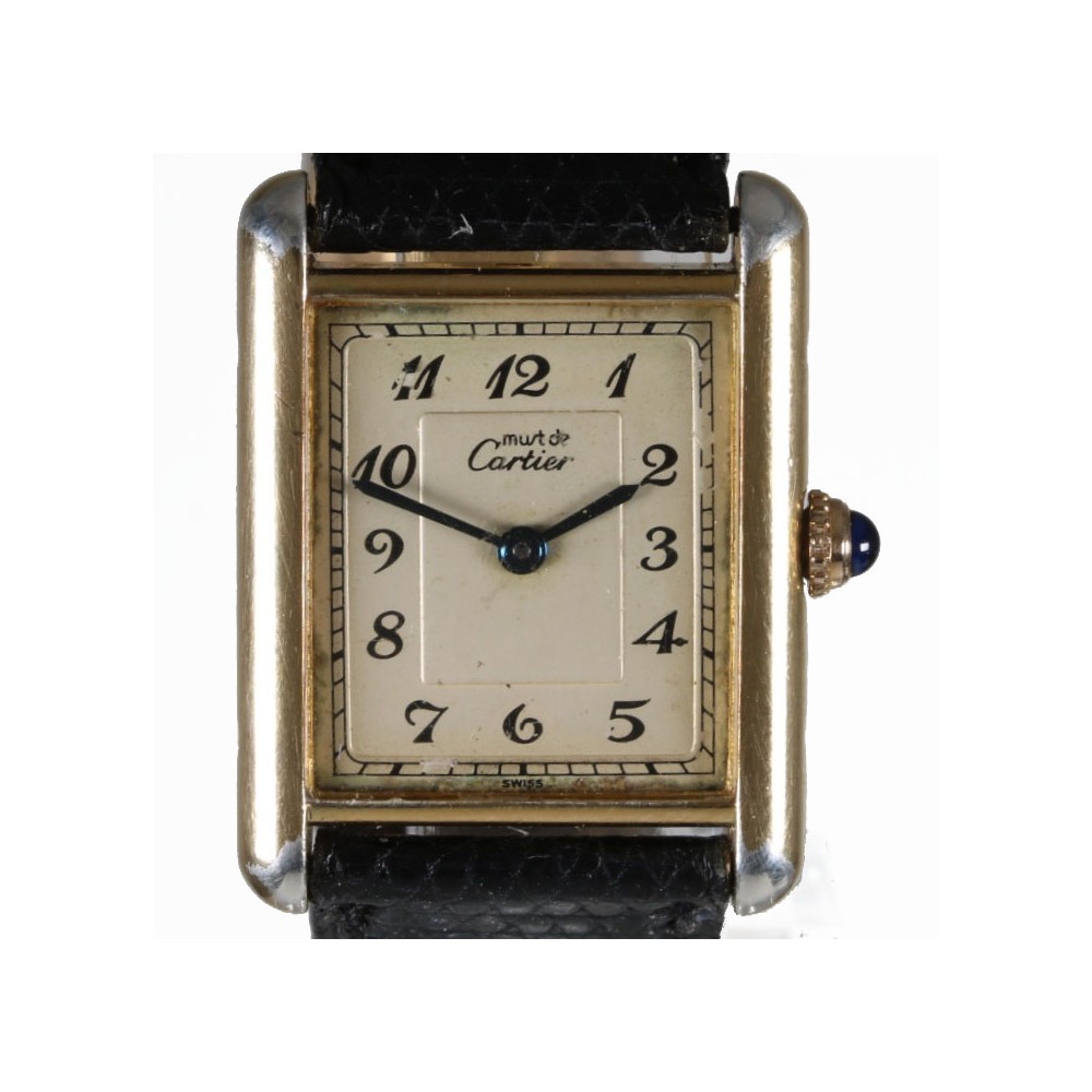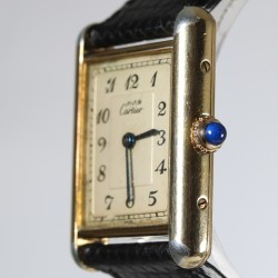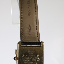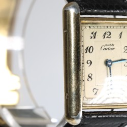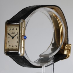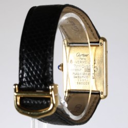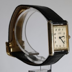 Cartier Tank de la línea Le Must con caja de plata chapada en oro de 23.5mm y cristal de zafiro. Movimiento de cuarzo funcionando. Correa y hebilla originales de Cartier. El reloj como puede verse en las dos últimas fotos tiene señales de uso y el chapado en las esquinas deja ver la plata inferior.