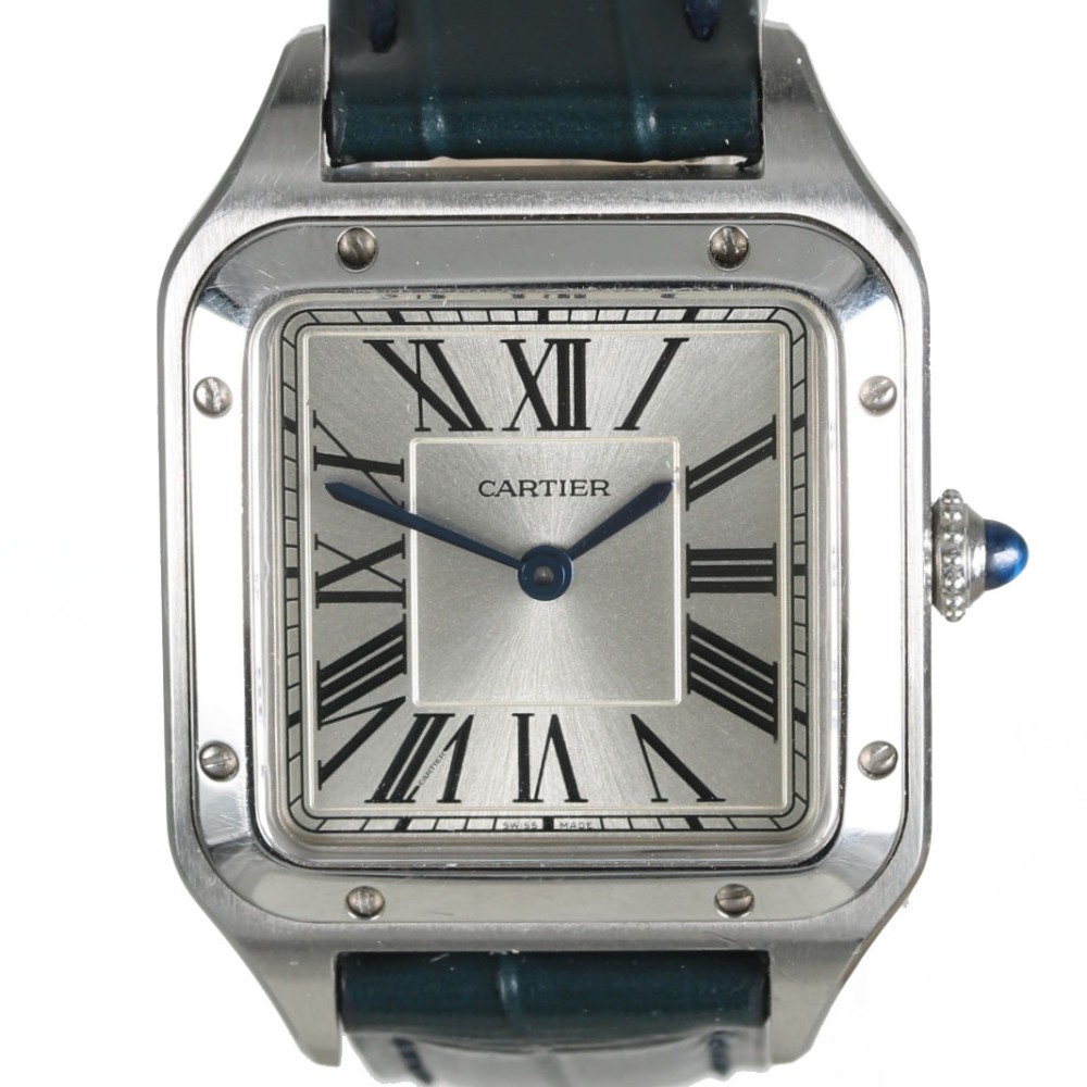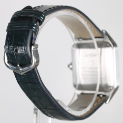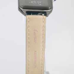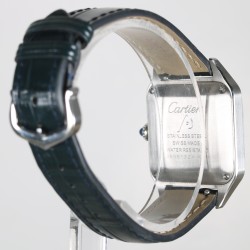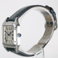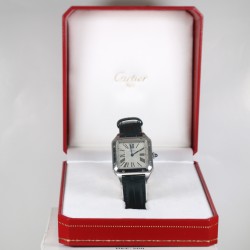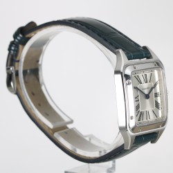 Cartier modelo Santos Dumont con caja de acero de 38mm x 27.5mm y cristal de zafiro. Movimiento de cuarzo funcionado perfectamente. Esfera plateada con números romanos. Correa y hebilla originales Cartier. El Santos, auténtico símbolo del legado de Cartier, rinde homenaje al legendario aviador Alberto Santos-Dumont. El reloj está en un estado excelente sin uso.